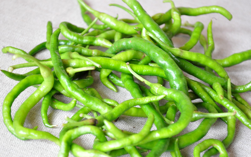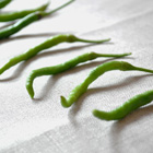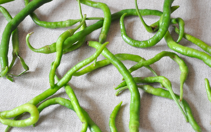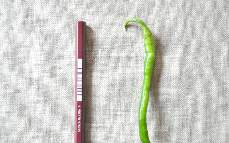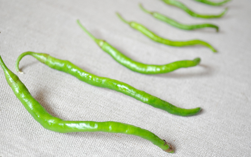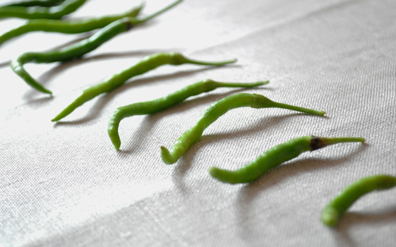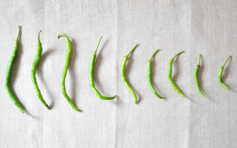 その名の通り、ひものようにしゅっとした細い形状が特徴です。辛みの少ない品種であり、古くから自給用野菜として奈良盆地を中心に盛んに栽培されてきました。現在では、独特の味と見た目が評価され、県外で「奈良を代表する野菜」として多く使われています。鉛筆と同じくらいの太さで、一般的な唐辛子と、その見た目の違いに驚きます。また、一味や七味に使われる鷹の爪などの品種と違い、辛味の少ない品種で、煮物や炒め物、また和食に限らず、フレンチなどにも相性がいい野菜です。