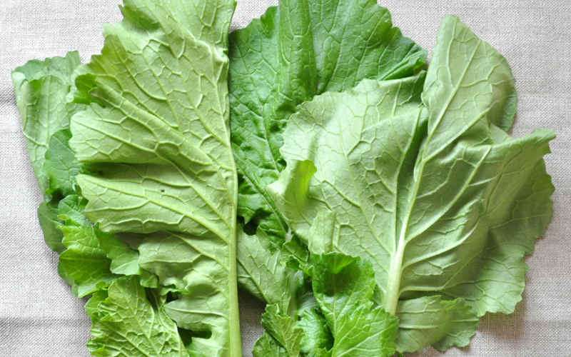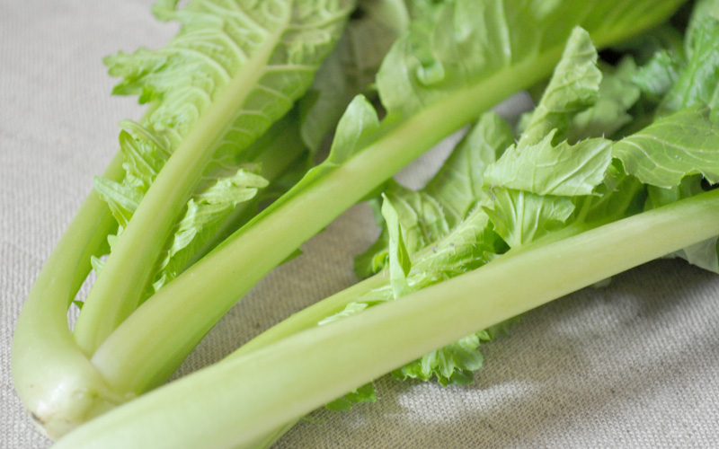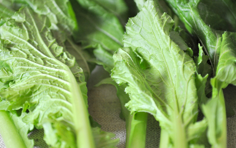 大和野菜として代表的である大和まな。小松菜と同じ仲間ですが、甘みが特徴で、特に12月以降、霜に当たると独特の風味と甘みが増します。古事記に栽培されていた記述があり、日本で最も古くから栽培されてきた野菜と考えられおり、奈良県自慢の野菜です。大和野菜の代表と言われるほどの大和まなは、実は数年前までは、県内でも多く知られていませんでした。その理由として、収穫が冬に限られていたことと、比較的短期間で黄変(葉の部分が黄色に変色すること)により流通が困難であったことが挙げられます。しかしながら、奈良県農業試験場が品種の系統選抜を行い、優良な性質を育成することによって特産化が進み、大和野菜として認定されるようになりました。