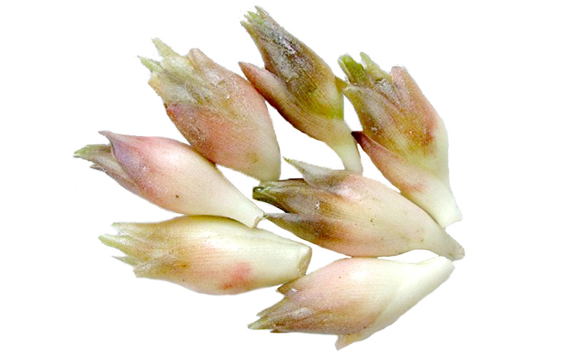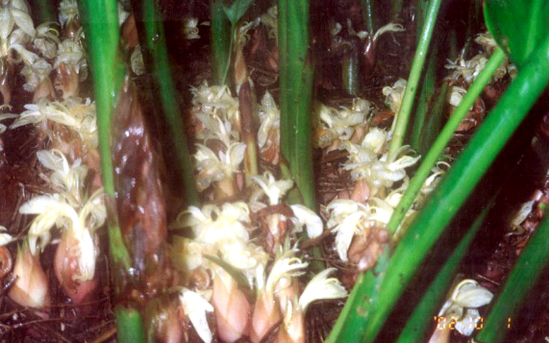 「魏志倭人伝」の中には既に栽培の記述があることから、古くから食用とされてきたとされる花みょうが。山椒や三つ葉のように、裏庭や屋敷林の木陰、多く育てられている作物のひとつです。花みょうがの独特の香りは、冷や奴やうどんの薬味として味を豊かにするものです。名前に花がついていますが、それは、みょうがの内部に開花前の蕾(花穂)を持っている為です。