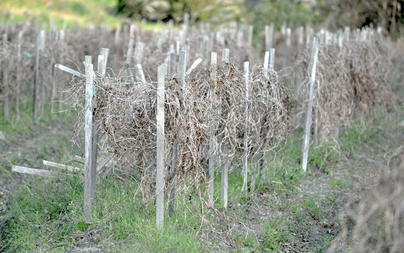 大和いもを育てる場合、植えたところに木材を立て、つるが上に伸びて行くようにします。これは、地面につるがうねうねと伸び続けてしまうと、害虫から守る為の消毒がしにくいことと、よく育つように葉に日光をよく当たるようにする為です。畑にはずらりと木材が立てられており、その光景は圧巻です。