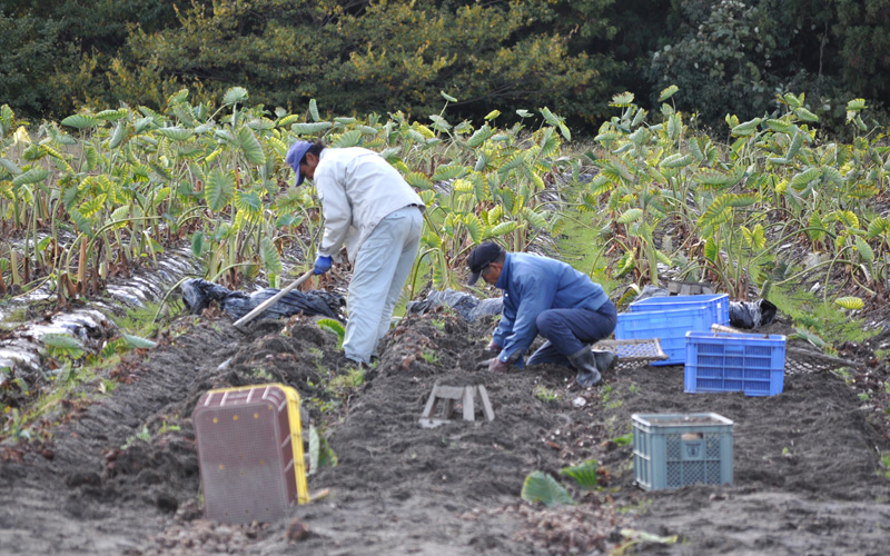 西川さんは、大和いもとは別の畑で里芋も栽培されています。里芋は大和いもと違い、一茎に多数の実を付けます。よって、里芋を掘り起こしてからも実を取る作業があり、大変手間がかかります。そこで、近所の方にお手伝いをしてもらい、協力してどんどん収穫するそうです。里芋は直売店に出荷するそうです。