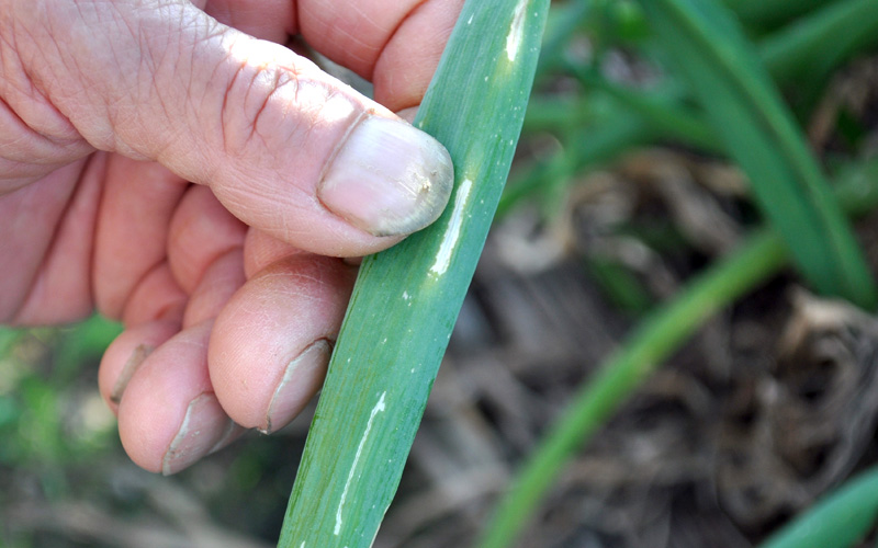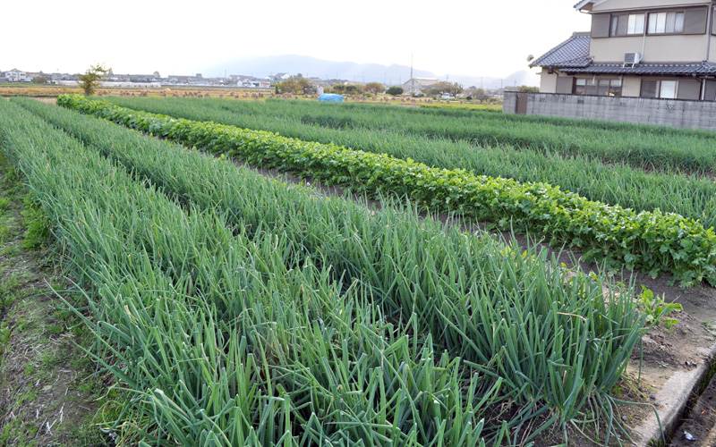 ネブカは他のネギと比べ、柔らかく、葉が曲がっているのが特徴です。その柔らかさの為に、葉が弱く、病気にかかりやすいそうです。葉の部分に付いている白い斑点の模様、薄茶色に変色したものは全て虫などによる病気だそうです。その病気にかかったネブカは、出荷することもできません。きれいな葉にする為には農薬を使用するしか方法がないみたいです。農薬を撒いても、ネブカの葉の中に虫が忍び込むことがあり、ネブカの入念なチェックは欠かせません。非常に手間がかけ、育てられています。